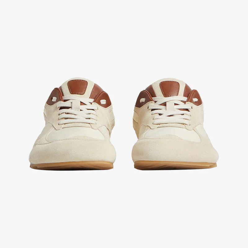 A sleek low-top lace-up sneaker blends soft suede with featherlight nylon, accented by leather trims for understated elegance. Lined with supple calf leather for all-day comfort, it showcases a Sea Salt/Caramel color palette that pairs versatility with warmth, finished with a durable rubber outsole for effortless stride.