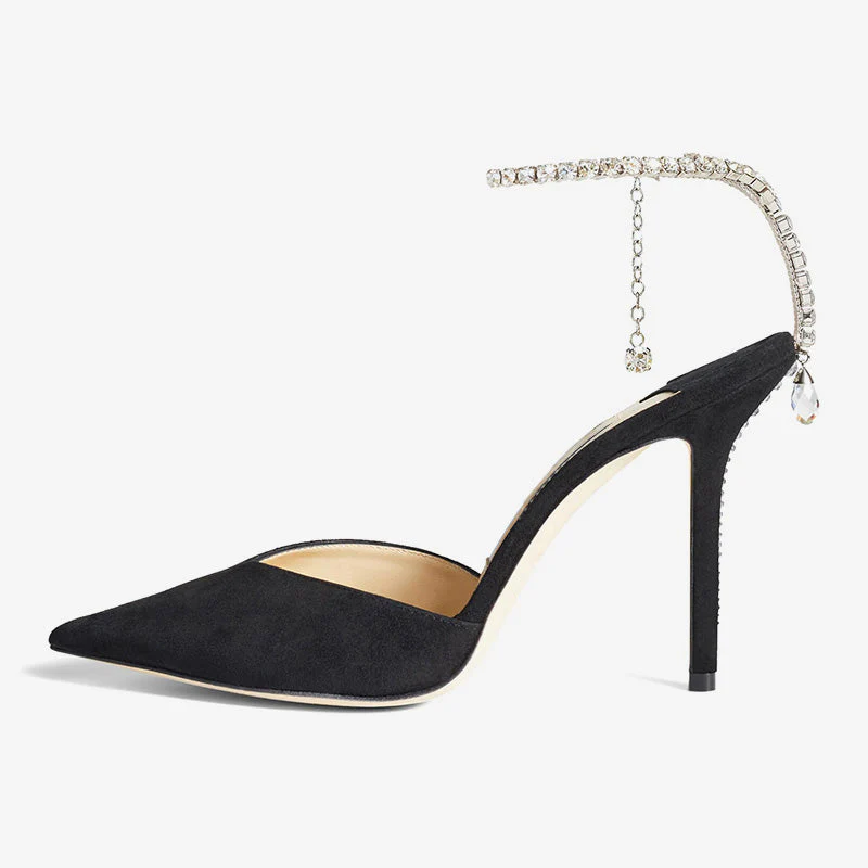 Crafted in Italy from black suede, these pumps feature a pointed toe, stiletto heel, and a delicate crystal chain that wraps the ankle and trails down the heel. A bold blend of elegance and statement sparkle.?