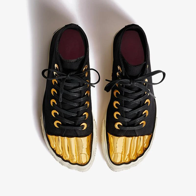 This original sneaker design features a sleek black canvas upper and is highlighted by our signature golden toes. The sole is adorned with a unique Measuring Tape pattern, and underneath, you'll find an artful trompe l'oeil footprint. Crafted from canvas, this sneaker blends practicality with distinctive style.