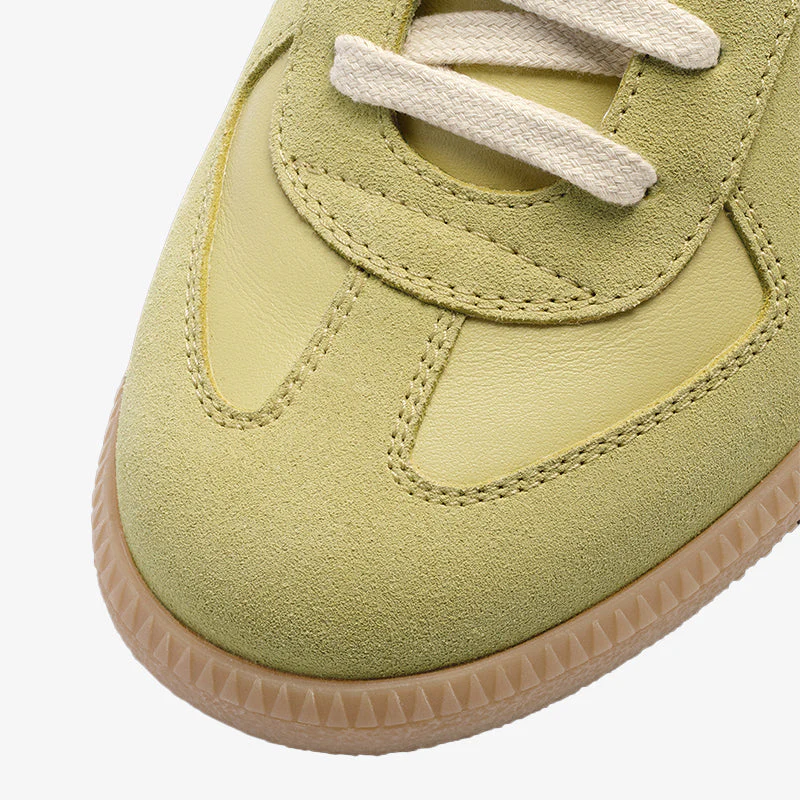 These sneakers, crafted from calf leather and suede in a refreshing mint green hue, are paired with a honey-toned rubber sole. Drawing inspiration from 1970s sports footwear, the design features timeless details, including white stitching at the back and a label. A perfect blend of vintage appeal and contemporary craftsmanship.