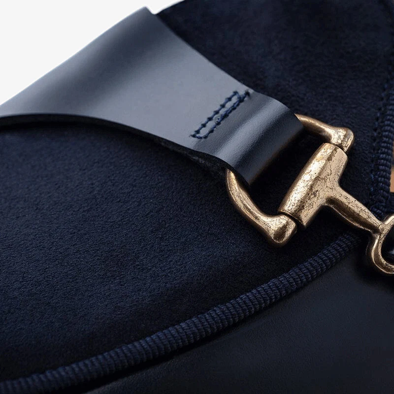 Handcrafted from polished navy calfskin, these elegant mules feature soft suede inserts and an antique gold-tone horsebit accent for a refined finish. Designed with a smooth calfskin upper and lining, subtle ribbed.