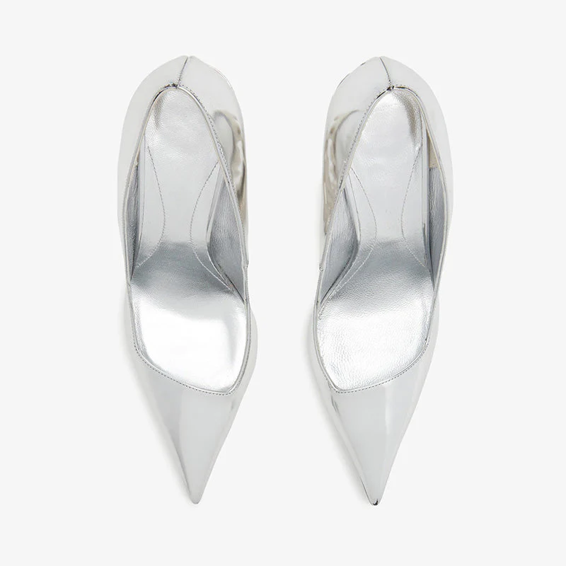 Striking and modern, these silver leather pumps feature a mirrored geometric heel and asymmetrical cut at the front. Finished with a pointed toe and smooth leather insole for bold elegance.Upper: 100% calf leather