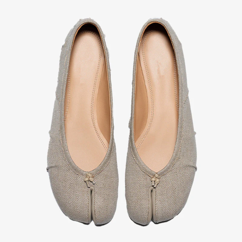 Step into elegance with these textured linen ballerina shoes, designed with intricate handmade folds for a truly unique look. The iconic Split-toe adds a distinctive touch, while the cotton knot detail at the front and white stitching at the back showcase the craftsmanship. With a luxurious calf leather lining and a durable rubber contrast sole, these shoes offer both style and comfort.