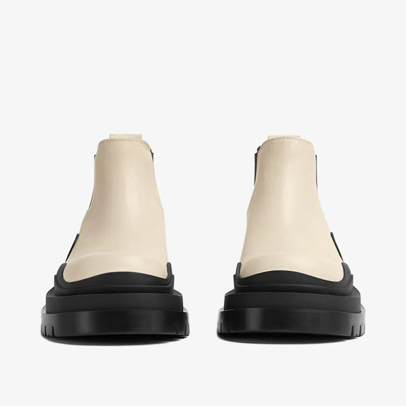 These cropped Chelsea boots are crafted from high-quality vegetally-tanned calf leather, offering a stylish earth yellow and black color combination. Featuring a 50mm flatform and durable rubber outsole, these boots provide both comfort and contemporary style.